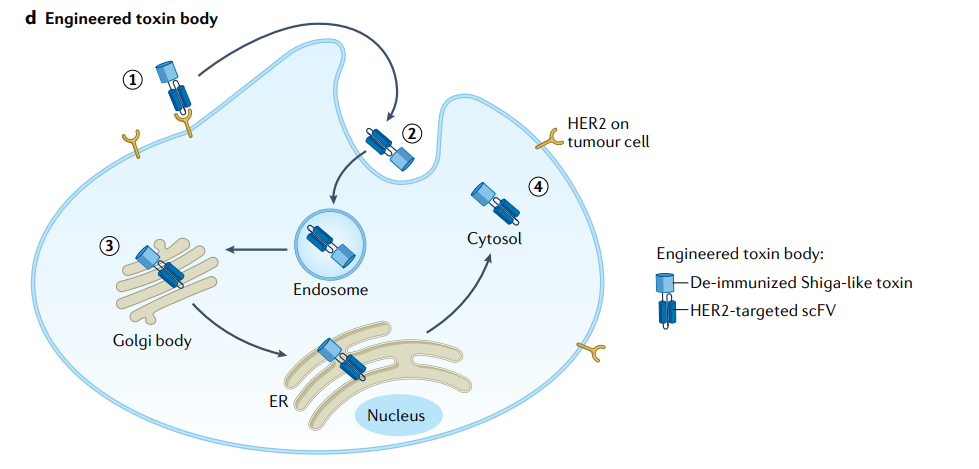 工程毒素体(ETBs)是一种结合了抗体特异性和细菌毒素细胞破坏机制的新型免疫毒素(图6)。MT-5111将去免疫ETB融合到HER2抗体产生了新的作用机制,通过酶促作用和永久性核糖体破坏作用直接杀伤细胞,从而潜在地绕过抗HER2 TKIs、ADC或抗体等的耐药机制[9]。