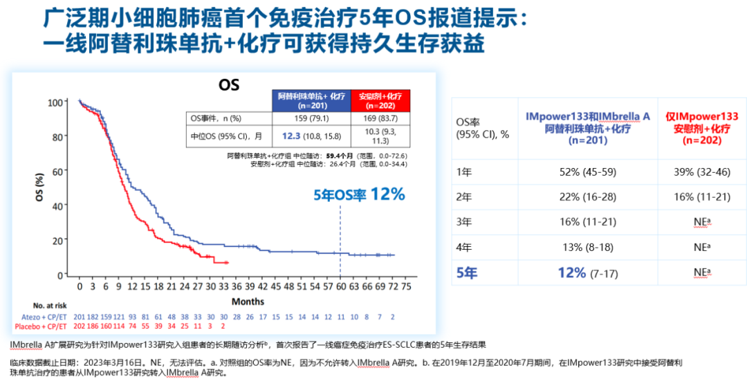 IMpower133研究中接受阿替利珠单抗+化疗治疗的患者如果在IMpower133研究结束时继续接受阿替利珠单抗治疗,或在IMpower133研究中停用阿替利珠单抗且处于生存期随访中,则可以转入IMbrella A扩展研究。IMpower133与IMbrella A拓展研究长期随访研究报告了全球首个ES-SCLC患者接受一线免疫联合治疗的5年生存数据,ES-SCLC患者的5年OS率提高到12%,较既往接受单纯化疗的患者5年OS率(~2%)提高至6倍。