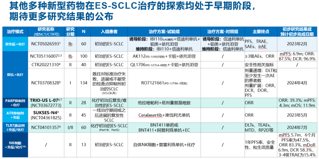 根据IMMU-132-01、NCT04826341和TROPION-PanTumor01的SCLC队列等数据,靶向Trop-2 ADC药物在SCLC中的研究结果令人鼓舞,期待更多大型前瞻性研究进一步证实其疗效。其他多种新型药物在ES-SCLC治疗的探索均处于早期阶段,期待更多研究结果的公布。