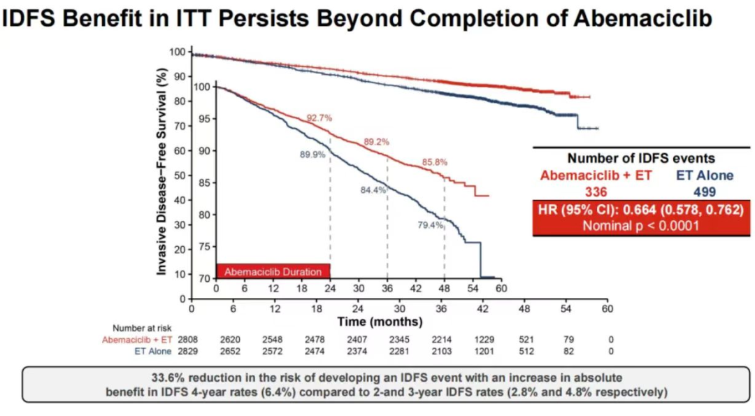 针对HR+/HER2-早期乳腺癌辅助强化治疗,我们目前可及的药物或者是研究主要有三个:阿得贝利——MonarchE研究,PARP抑制剂——OlympiA研究,瑞波西利——NATALEE研究。首先是MonarchE研究,纳入的患者人群是HR+/HER2-,同时合并高危因素的早期乳腺癌患者,该研究对于高危的定义是:≥3个阳性淋巴结,或者1-3个淋巴结转移、肿瘤较大(≥5cm),或者组织学分级为3级(G3),或者是Ki-67≥20%。对于这些患者给予阿贝西利联合内分泌治疗强化辅助治疗后,相比于单用内分泌治疗,主要研究终点iDFS获益显著(HR 0.664,P<0.0001)无论是2年、3年、还是4年的iDFS,都呈现明显的持续的获益[4]。到目前来看,MonarchE研究是HR+/HER2-早期乳腺癌辅助强化治疗领域随访时间最长的、数据最为可靠的研究,也得到了领域内专家学者的一致认可。