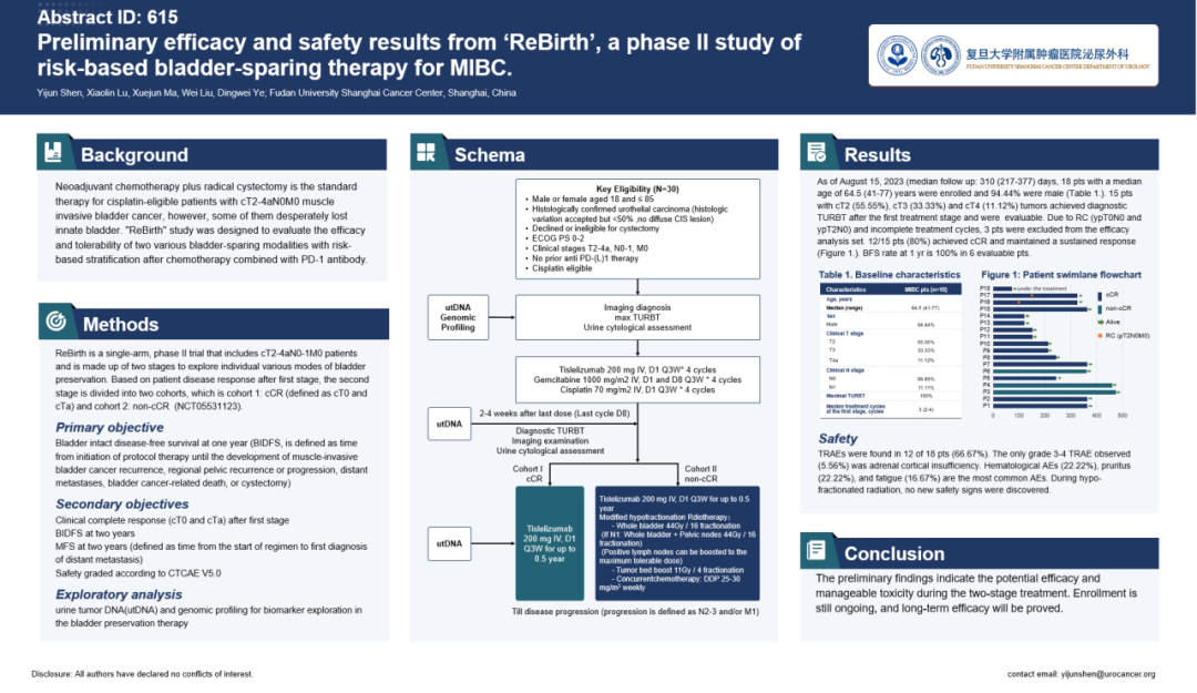 “Rebirth(新生)”是一项纳入cT2-4aN0-1M0的顺铂耐受MIBC患者的两阶段保膀胱研究,患者首先接受4个周期的替雷利珠单抗联合吉西他滨及顺铂治疗,依据临床缓解状态分2个治疗组:实现临床完全缓解(cCR)的患者进行8个周期的替雷利珠单抗维持治疗,未实现cCR的患者进行同步放化疗联合替雷利珠单抗的维持治疗。