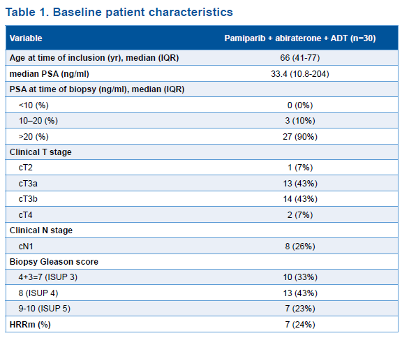 截止到2023年8月,研究共纳入了30名患者。针对已完成新辅助治疗和手术的29名患者进行分析。患者中位年龄64岁,患者入组时的中位PSA为33.4 ng/ml(10.8~204 ng/ml),临床分期≥cT3期占比97%(29/30),患者Gleason评分≥8分占比66%(20/30),大多数患者为局部进展性前列腺癌。HRR突变患者占比24%(7/30)(Table 1)。