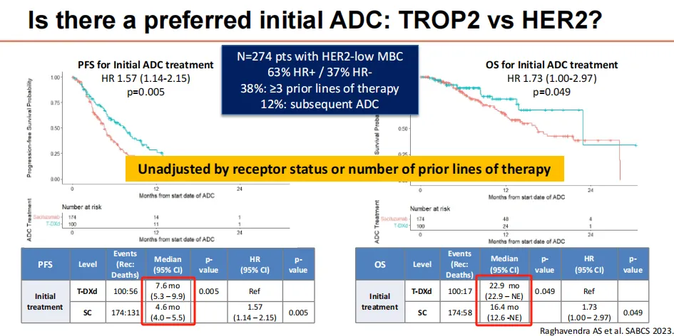 胡海教授:确实,ADC药物序贯治疗(ADC after ADC)是当前临床热议的焦点问题之一。可以肯定的是,ADC后再使用ADC是潜在可行的策略,但需要注意避免ADC药物之间可能存在的靶点/抗体和载药的交叉耐药问题,因此,“after”之后应选择另一种靶点/抗体或载药机制的ADC药物。那么,在目前可及的ADC中,HER2 ADC和Trop-2 ADC应该如何进行排序?2023年SABCS大会的一项真实世界研究为我们带来一定的提示。