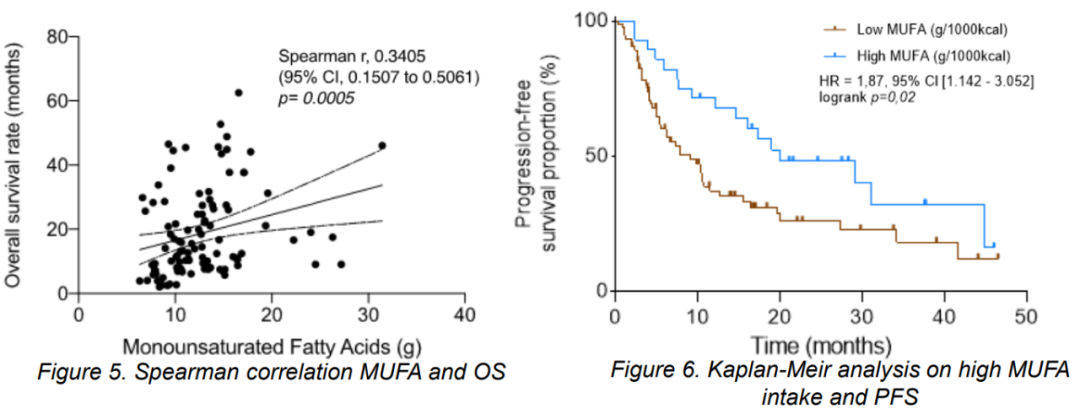 与低MUFA摄入量相比,高MUFA摄入量与PFS延长相关,分别为20.0个月和9.1个月(HR=1.87,95%CI[1.142~3.052;P=0.02),OS也更长(图)。