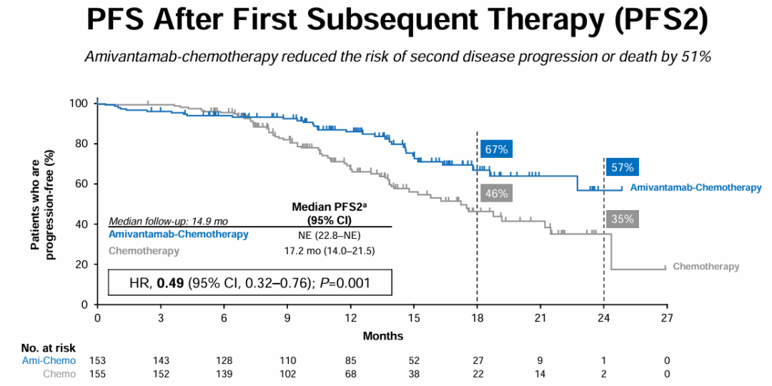 2024 ELCC展示的PAPILLON研究进展后结果显示,中位随访14.9个月时,联合治疗的中位至治疗终止时间(TTD)为13.2个月(95%CI:11.8-15.2),单独化疗为7.5个月(95%CI:7.0-8.4)(HR=0.38;95%CI:0.28-0.51;P<0.0001);在12个月和18个月时,Amivantamab+化疗组分别有58%和35%的患者仍在接受治疗,而单独化疗组的对应数据仅为21%和5%。联合治疗组的中位至后续治疗时间(TTST)为17.7个月(95%CI:13.7-不可评价[NE]),单独化疗组为9.9个月(95%CI:8.6-11.1)(HR=0.35;95%CI:0.25-0.49;P<0.0001)。在12个月和18个月时,联合治疗组分别有68%和49%的患者未接受后续治疗,而单独化疗组分别有36%和14%的患者未接受后续治疗。