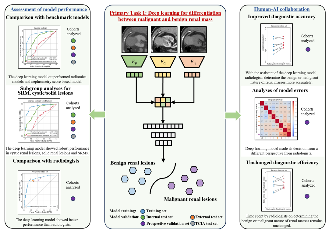 为了解决肾肿物术前诊断的这两个痛点,在郭剑明教授牵头下,熊鹰医师等回顾性纳入了复旦大学附属中山医院,浙江大学附属第一人民医院,张掖市人民医院,泉州市人民医院,复旦大学附属中山医院厦门医院等国内六家医院及肿瘤影像数据库共4557例患者的13261套CT图片,采用2个多期相神经卷积网络分别构建了预测肾肿物良恶性及侵袭性的深度学习诊断模型。该良恶性诊断模型在不同验证队列中AUC在0.853~0.898之间,在各个队列中均较目前影像组学预测模型以及RENAL评分预测模型有着更好的预测效能,并在囊性肾癌、实性肾癌及小肾癌中均有着良好的表现。研究人员比较了深度学习诊断模型和7名来自三家医院的影像科医生的诊断准确率,发现深度学习模型良恶性鉴别的准确率已经超越了其中6名影像科医生的诊断准确率。同时,在AI诊断模型的协助下,影像科医生诊断准确率得到显著提高。
