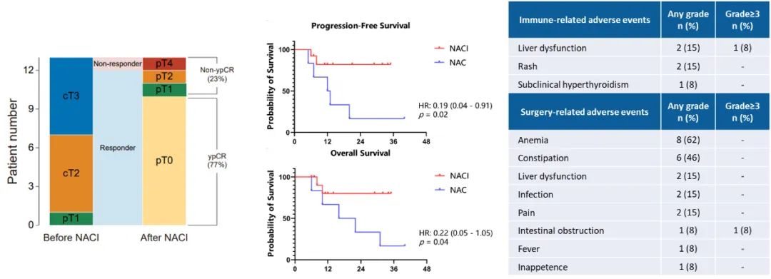 所有患者均完成了4个周期的NACI治疗和标准根治性膀胱切除术。ypCR率达到77%(10/13)。与接受NAC的患者相比,NACI组在无进展生存期(风险比<hr/>0.19,95%置信区间[CI]0.04–0.91;P=0.02)和总生存期(HR 0.22,95%CI 0.05-1.05;P=0.04)方面表现优越。安全事件与泌尿上皮癌的先前研究一致。10名(77%)和3名(23%)患者分别出现了治疗相关和免疫相关不良事件(AE)。3名患者(23%)出现了3级AE。没有参与者在治疗中停用PD-1抑制剂。没有观察到4级或5级AE。