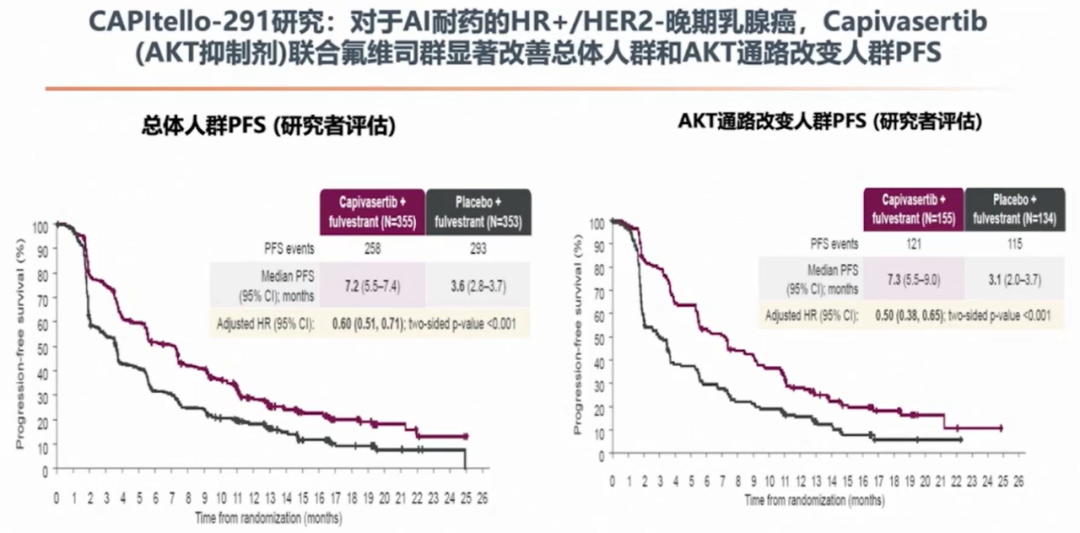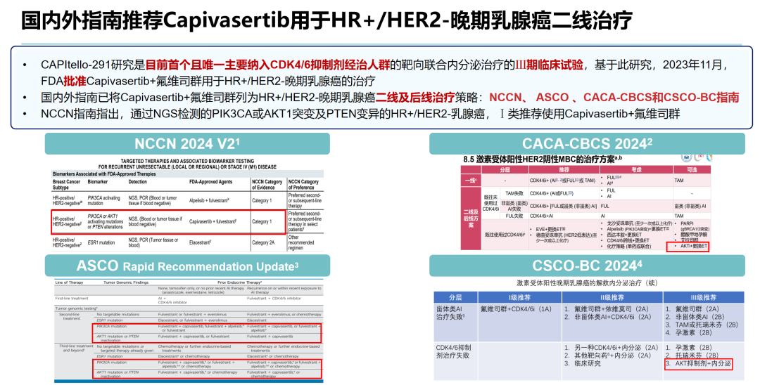 近年来,PI3K-AKT-mTOR通路抑制剂涌现了不少潜力“新星”。首先是Capivasertib作为全球首创(first-in-class)的AKT抑制剂(AKTi),经过全球3期CAPItello-291研究证实,对于CDK4/6i或ET经治失败的晚期HR+乳腺癌患者,Capivasertib+氟维司群相较于单独使用氟维司群可显著改善全体人群(7.2 vs 3.6个月,HR 0.60,P<0.001)和AKT通路异常患者(7.3 vs 3.1个月,HR 0.50,P<0.001)的无进展生存期(PFS);且总生存期(OS)也有获益趋势;中国队列也显示相似或更好的获益趋势;在安全性方面,Capivasertib组的停药率仅为13%,高血糖(2.3%)和口腔炎(2.0%)等受关注的≥3级不良事件(AE)发生率较低,常见AE以临床处理相对简单、成熟的腹泻和皮疹为主。基于该研究,2024年V2版NCCN指南、2024年的ASCO快速推荐更新、2024年CACA-CBCS指南和CSCO BC指南等国内外权威指南均将Capivasertib作为HR+/HER2-晚期乳腺癌的二线治疗推荐。