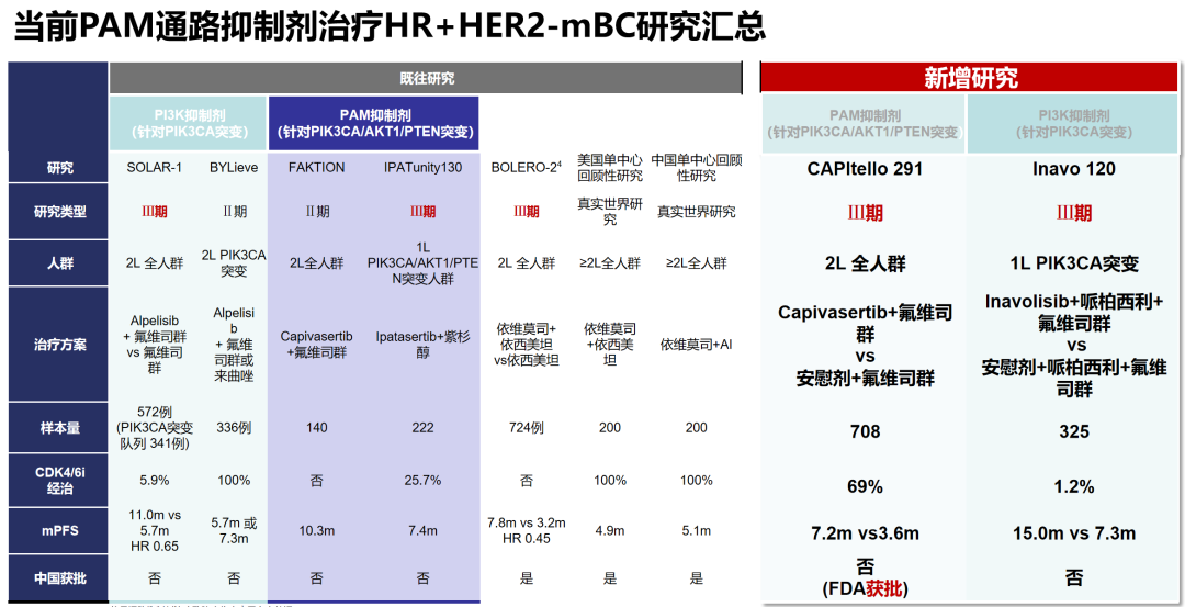 (1)在新药及其适用人群中,基于CAPItello-291研究,新增Capivasertib+氟维司群用于PIK3CA/AKT1/PTEN突变HR+/HER2-晚期乳腺癌的二线治疗;基于INOVA120研究,新增Inavolisib+CDK4/6i+氟维司群用于PIK3CA突变HR+/HER2-晚期乳腺癌的一线治疗。