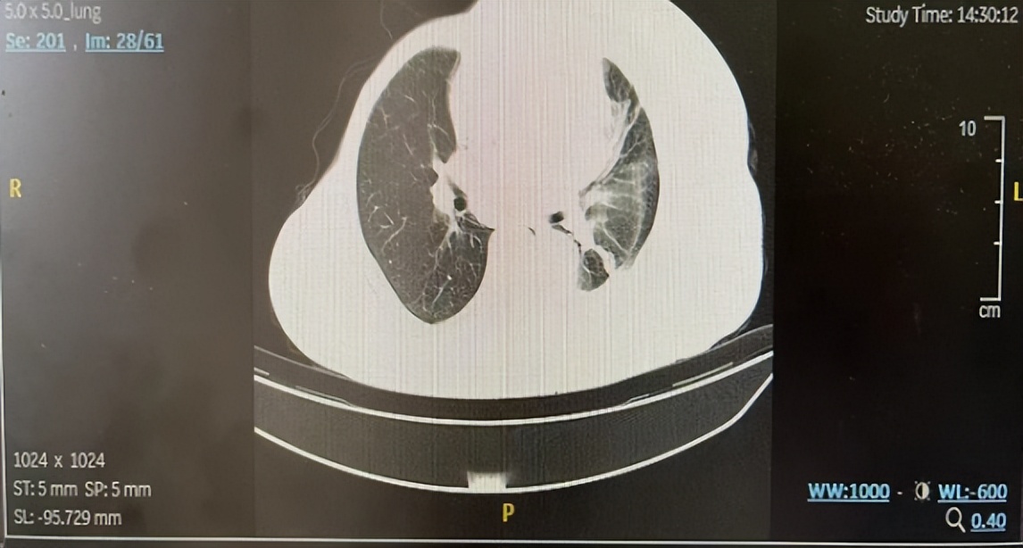 图3.抗炎治疗3周后胸部CT示左肺炎好转
