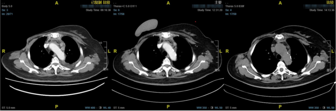 图4.纵隔淋巴结(左:基线;中:2周期后;最近一次复查)