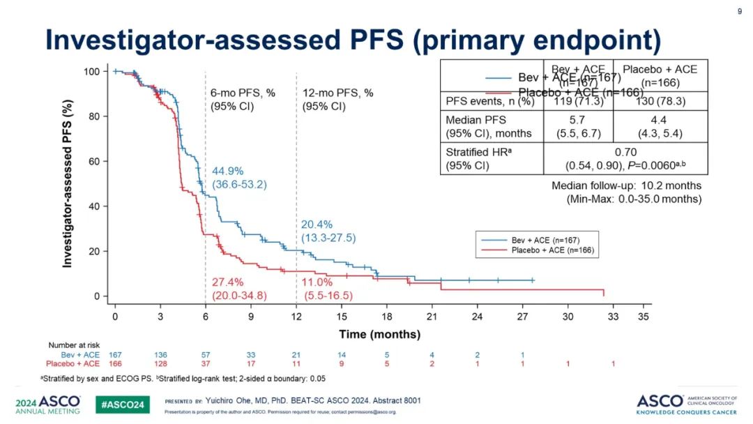 接受贝伐珠单抗+ACE治疗的患者中,研究者评估的中位PFS为5.7个月,而接受安慰剂+ACE治疗的患者中位PFS为4.4个月(风险比<hr/>=0.70;P=0.0060)。