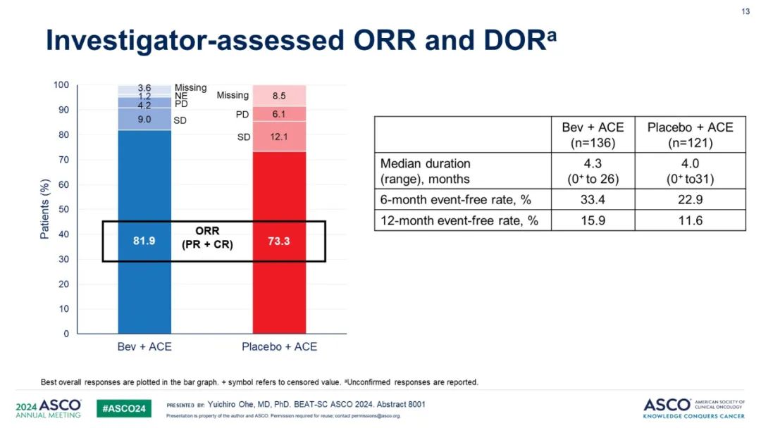 接受贝伐珠单抗+ACE治疗的患者客观缓解率(ORR)为81.9%,安慰剂+ACE组为73.3%,中位缓解持续时间(DOR)分别为4.3和4.0个月。