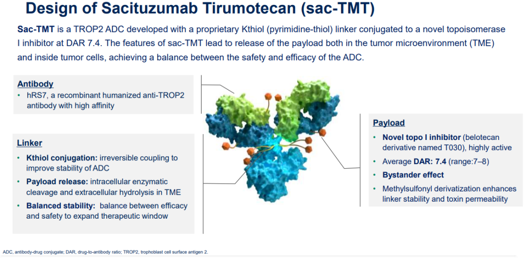 芦康沙妥珠单抗是首个中国原创、国际品质的TROP2ADC。靶向TROP2的人源化单克隆抗体,通过优化的连接子CL2A与自研的新型拓扑异构酶I抑制剂T030(KL600023)偶联而成。具有5个特点:第一、高亲和力和靶向效应,第二、高活性自研的新型拓扑异构酶I抑制剂T030,第三、稳定性和亲水性更好的连接子CL2A,第四、平均药物抗体比(DAR)高达7.4、第五、旁观者效应。