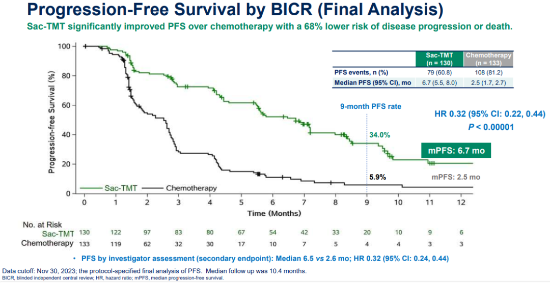 患者被随机分配到芦康沙妥珠单抗组(130例)和化疗组(133例)。两组基线均衡,符合当下的临床实践状况。数据截止至2023年11月30日,中位随访10.4个月患者,达到了主要终点PFS,根据BICR评估,芦康沙妥珠单抗组和化疗组的中位PFS分别为6.7个月和2.5个月,延长了近3倍;进展或死亡风险降低了68%(HR:0.32;95%CI:0.22~0.44;P<0.00001)。