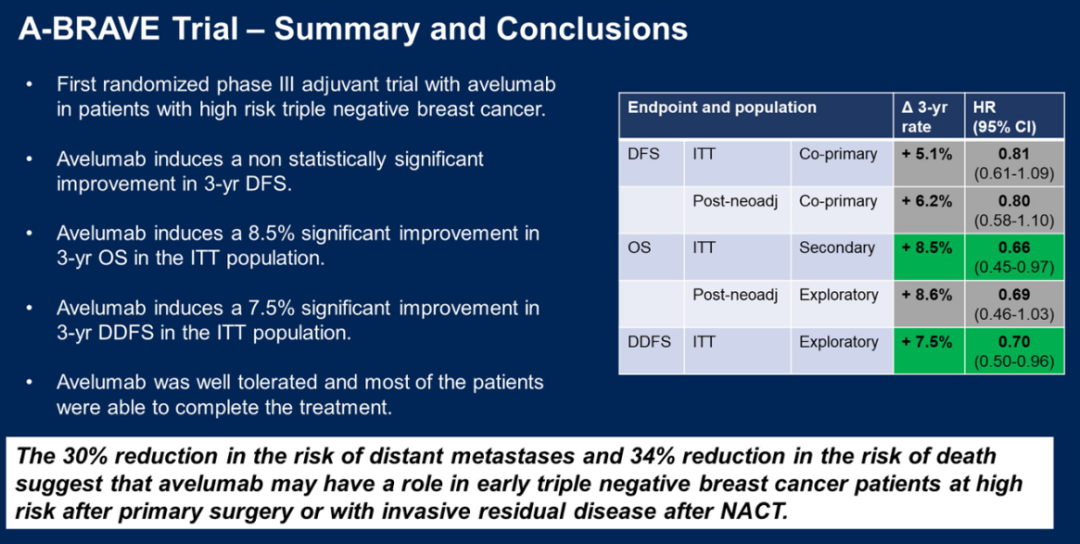 有趣的是,我们在A-BRAVE研究的次要终点3年总生存率(OS)却看到了显著提升。究竟OS和DFS的获益差异缘何而起,目前尚不清楚。但单从ICI在辅助阶段的强化治疗理念上来讲无疑是取得了开创性的突破,特别是对那些新辅助阶段未使用ICI且存在残余病灶的TNBC者,甚至辅助阶段用到卡培他滨强化者,未来或许可以尝试在辅助强化阶段序贯使用ICI,或卡培他滨联合ICI等方案。