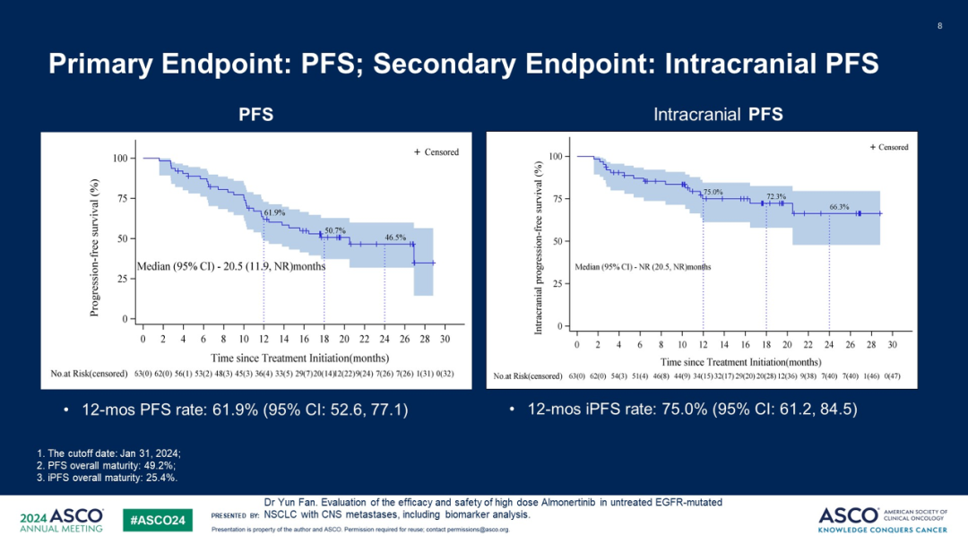 ACHIEVE研究共纳入了63例患者,每日接受一次165 mg的阿美替尼口服治疗。研究的首要终点为12个月的无进展生存(PFS)率。次要研究终点则包括颅内PFS(iPFS)、系统客观缓解率(ORR)和颅内ORR(iORR)、持续缓解时间(DOR)、疾病控制率(DCR)、总生存(OS)、生活质量等。截止2024年01月31日,研究的中位随访时间为18.7个月。