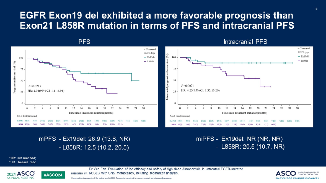 亚组分析显示,EGFR 19del患者的PFS、OS获益较21 L858R患者更好。