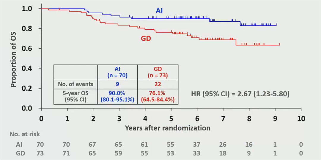 2014年2月至2018年9月,共有143例患者入组,5年随访已于2023年9月完成。AI组70例和GD组73例患者均纳入疗效分析。在中位随访6.0年的最终分析中,AI组和GD组的5年OS率估计为90.0%(95%CI:80.1~95.1)和76.1%(95%CI:64.5~84.4)(HR 2.67,95%CI:1.23~5.80);5年无进展生存(PFS)率估计为65.2%(95%CI:52.7~75.2)和57.4%(95%CI:45.2~67.8)(HR 1.33,95%CI:0.81~2.18)。在5年随访分析中,两组均未出现治疗相关死亡。