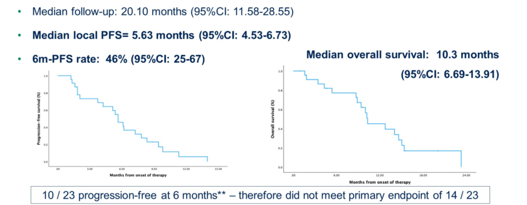 2019年12月至2023年10月,7个中心共纳入了24例患者,中位年龄60岁(38~76岁)。其中16例(66%)为男性。患者既往中位治疗线数1(0~2)。共有23例患者可评估,中位随访时间为20.1个月(95%CI:11.6~28.6)。根据局部部位评估,中位PFS为5.6个月(95%CI:4.5~6.7);6个月PFS率为46%(10/23,95%CI:23~66),中位OS为10.3个月(95%CI:6.7~13.9)。