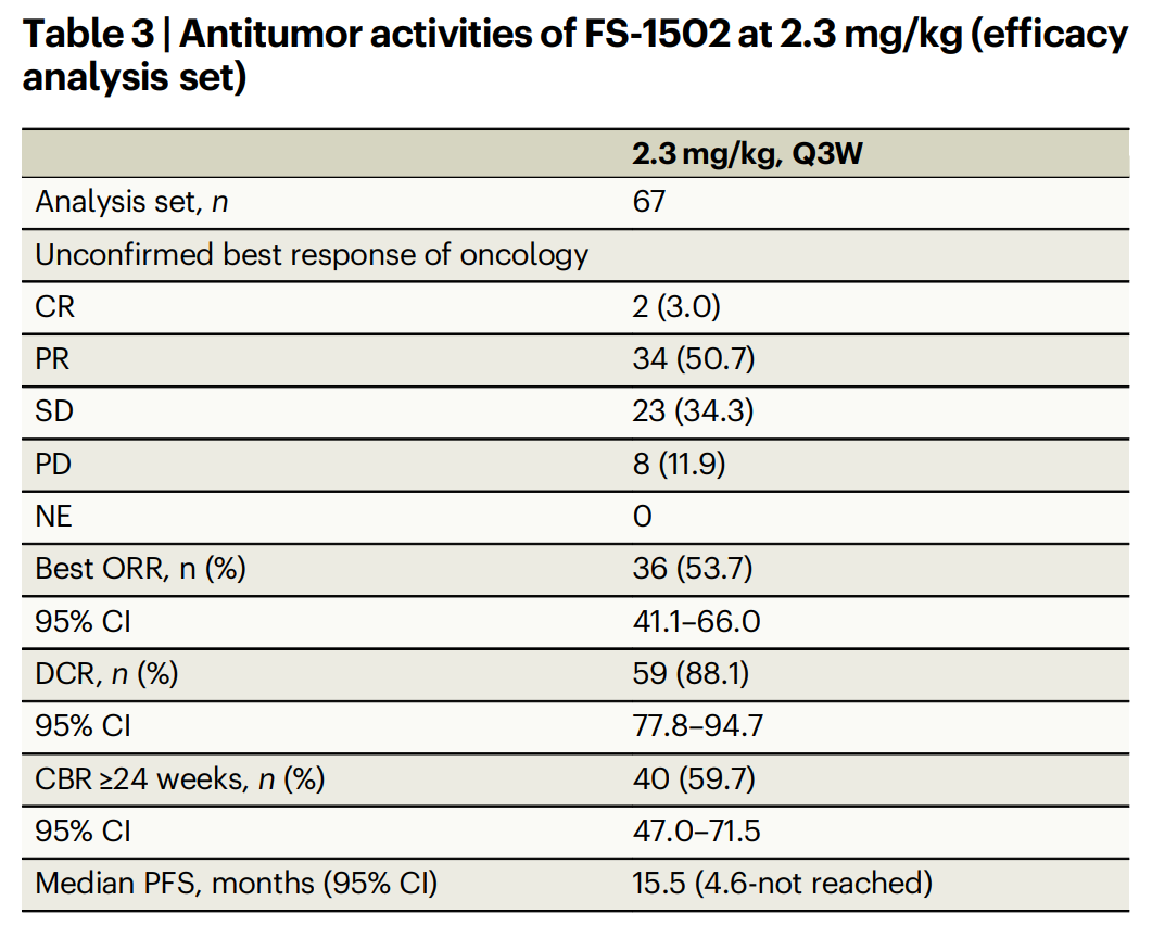 在抗肿瘤活性方面,FS-1502展现出令人鼓舞的疗效。在HER2阳性乳腺癌患者中,3.0%的患者实现了完全缓解(CR),50.7%的患者实现了部分缓解(PR),客观缓解率(ORR)达到了53.7%,疾病控制率(DCR)和≥24周的临床获益率(CBR)分别为88.1%和59.7%。此外,患者的中位持续缓解时间(DoR)为2.7个月,中位无进展生存期(PFS)达到了15.5个月。