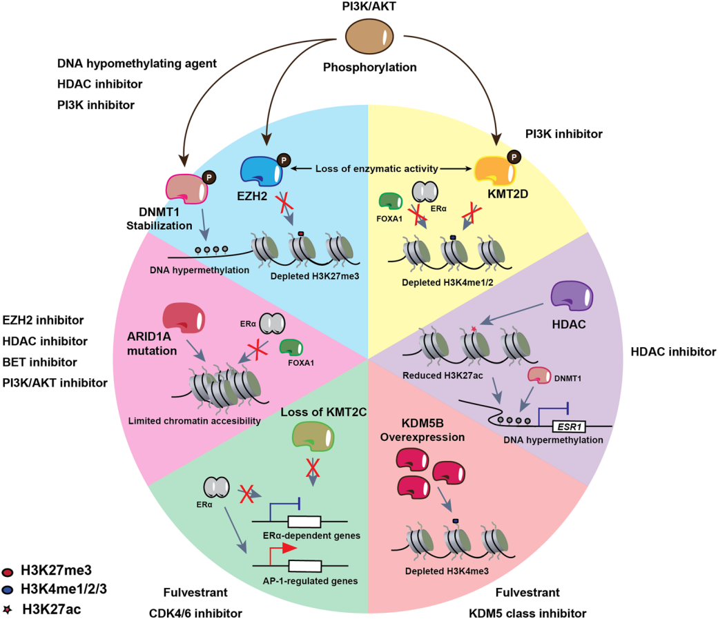 △HDACi治疗耐药性ER+乳腺癌中各种失调的表观遗传学通路的示意图