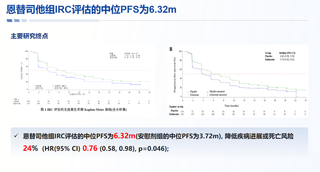 研究结果显示,IRC评估的恩替司他组中位无进展生存期(PFS)显著长于安慰剂组(6.32 vs.3.72个月),降低了24%的疾病进展或死亡风险(HR 0.76)。同时,恩替司他组中位总生存期(OS)为38.55个月,较安慰剂组延长超过9个月,降低死亡风险25%(HR 0.75),显示出了较好的生存获益。CDK4/6i耐药患者和既往接受过解救化疗的患者中同样显示出较好的疗效。此外,恩替司他在无内脏转移、原发内分泌耐药、既往未使用过氟维司群的患者中获益更明显。
